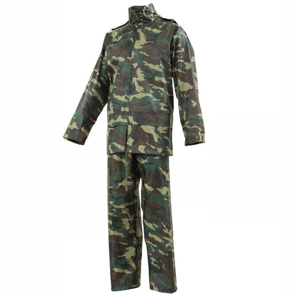 Tessuto poliestere 100% spalmato PVC g/mq 190 Cuciture nastrate Cappuccio ripiegato interno colletto Aerazione su dorso e sotto ascelle Cerniera centrale ricoperta – 2 tasche con patta Maniche soffietto interno antivento Pantalone elastico in vita – Aperture passamano Colore verde mimetico