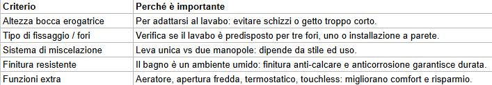 Ecco alcuni criteri in sintesi per selezionare un buon rubinetto da bagno: